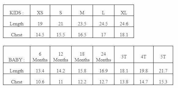 US Standard SIZE Chart of T-shirt,Sweater,Hoodie,Long Sleeve, Kids and Baby Toodler (inches)